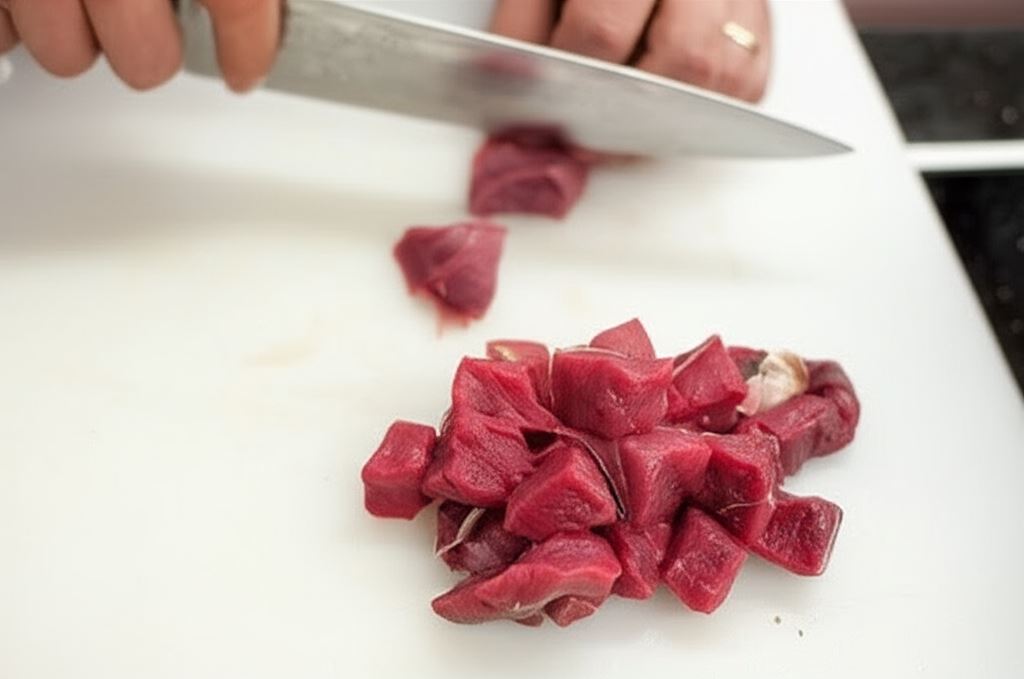 Wołowinę przepłucz pod zimną bieżącą wodą. Osusz papierowym ręcznikiem i pokrój na kostki o wymiarach około 2x2 cm.