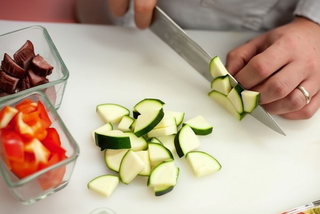 Kiełbasę, cebulę, cukinię i paprykę potnij w kostkę, czosnek przepuść przez praskę lub drobno posiekaj.