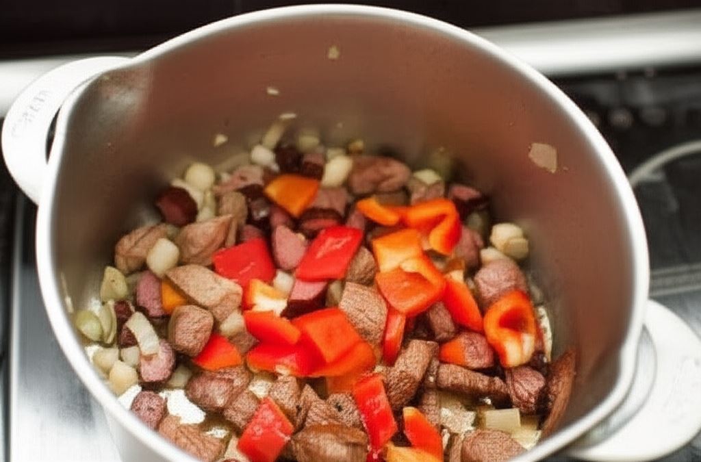 Rozgrzej tłuszcz w garnku i zrumień mięso. Potem dodaj kiełbasę, cebulę, czosnek i paprykę. Smaż wszystko przez ok. 5 minut.