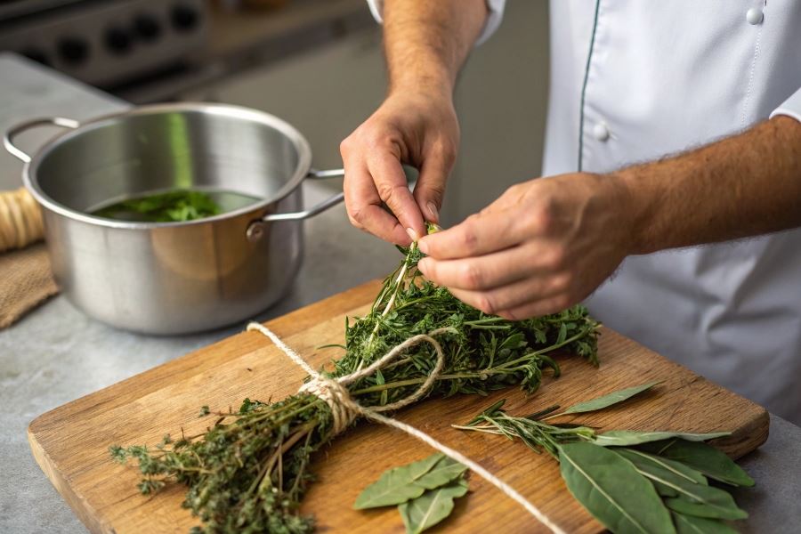 • Metoda tradycyjna: Związanie świeżych ziół (tymianek, rozmaryn, liść laurowy) bawełnianym sznurkiem kuchennym, co pozwala na łatwe wyjęcie po zakończeniu gotowania