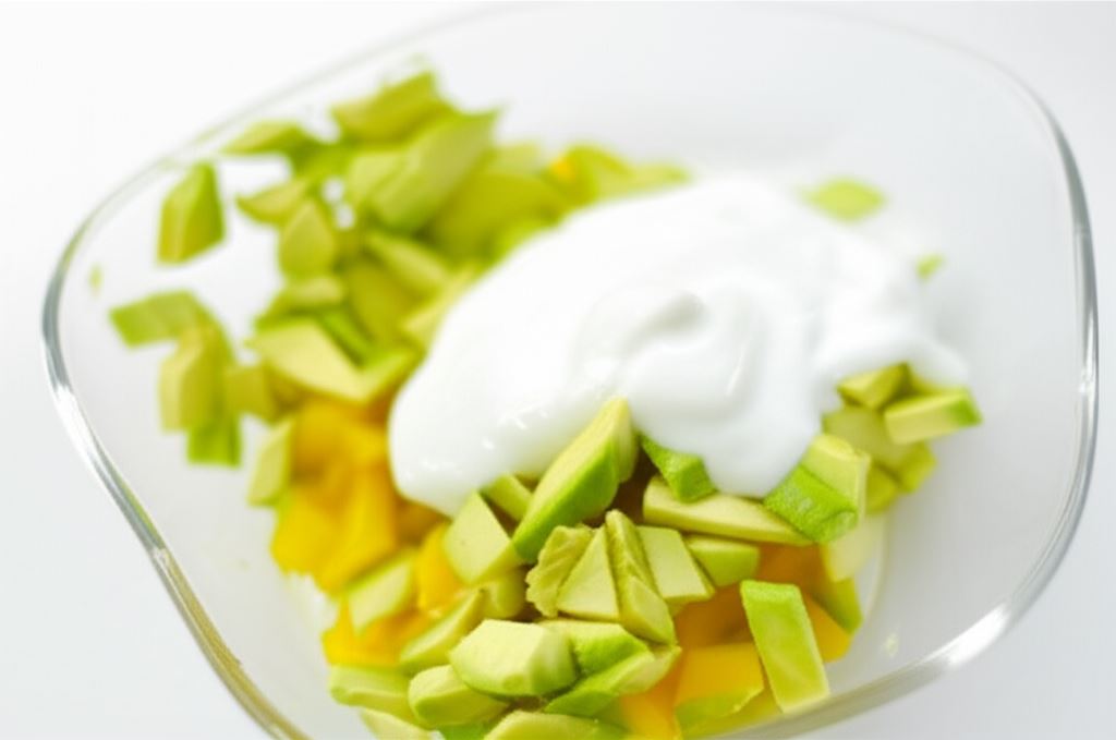 Sporządź salsę z awokado i mango: obierz owoce ze skórki, wyjmij pestki i pokrój w kostkę. Połącz z jogurtem oraz sokiem z cytryny, przypraw czarnym pieprzem. Potem nakryj i umieść w lodówce.