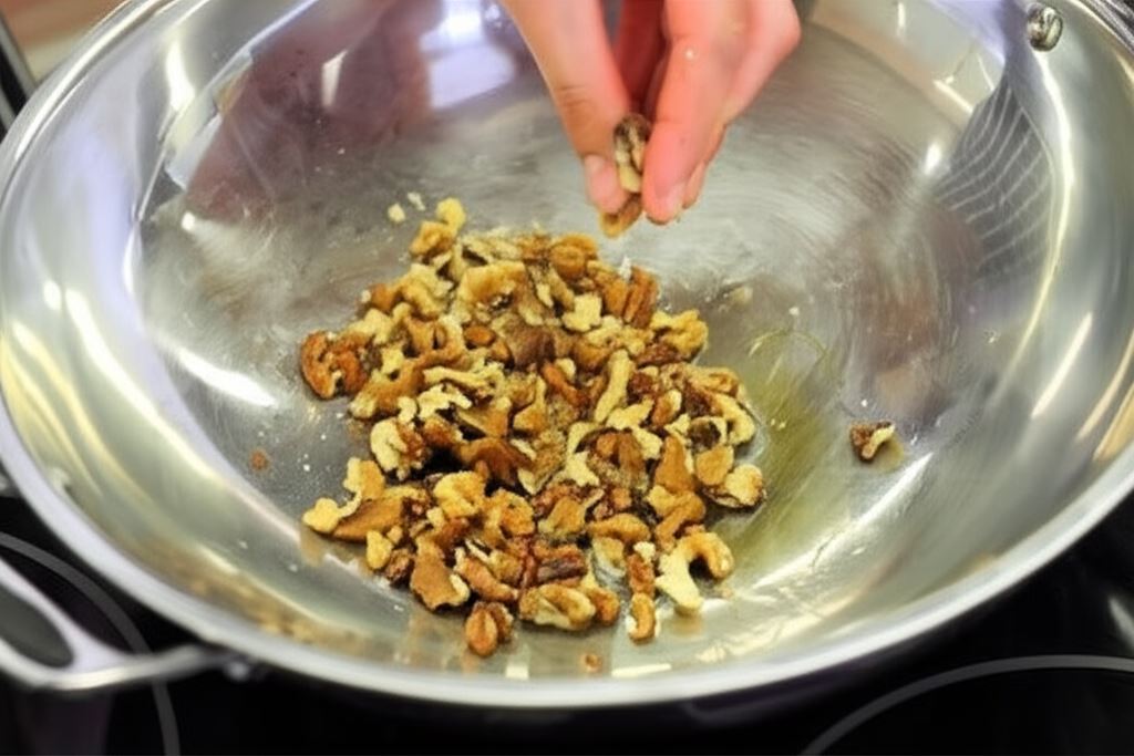 Porządnie nagrzej tłuszcz w woku. Przesmażaj grubo posiekane orzechy przez minutę.