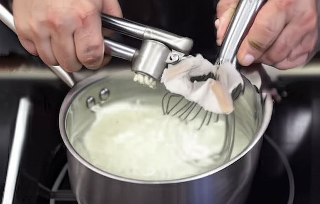 Fix Makaron kremowe 4 sery z mazzarellą Knorr połącz ze śmietanką i przeciśniętym przez praskę czosnkiem. Następnie zagotuj.