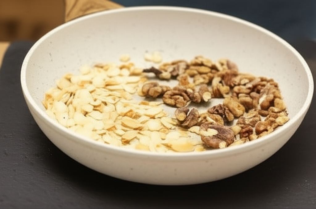 Na suchej patelni podpraż orzechy włoskie, a potem migdały.