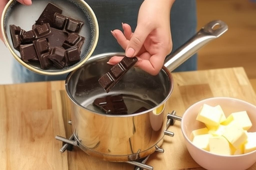W garnku doprowadź wodę do wrzenia, rozpuść cukier i cukier wanilinowy, odłóż na bok. Dodaj czekoladę i masło, zaczekaj, aż składniki się rozpuszczą i zamieszaj.