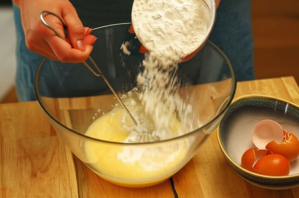 Roztrzep jajka w misce, wsyp mąkę i wymieszaj dokładnie rózgą.