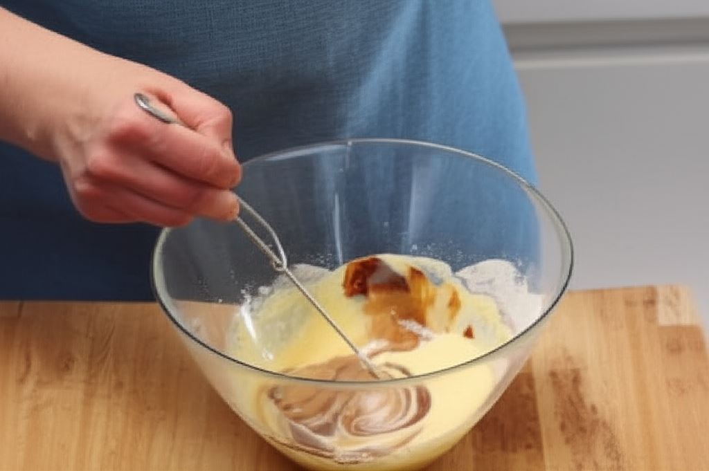 Potem powolnym strumieniem dolewaj czekoladę do jajek zmieszanych z mąką, nieustannie mieszając.