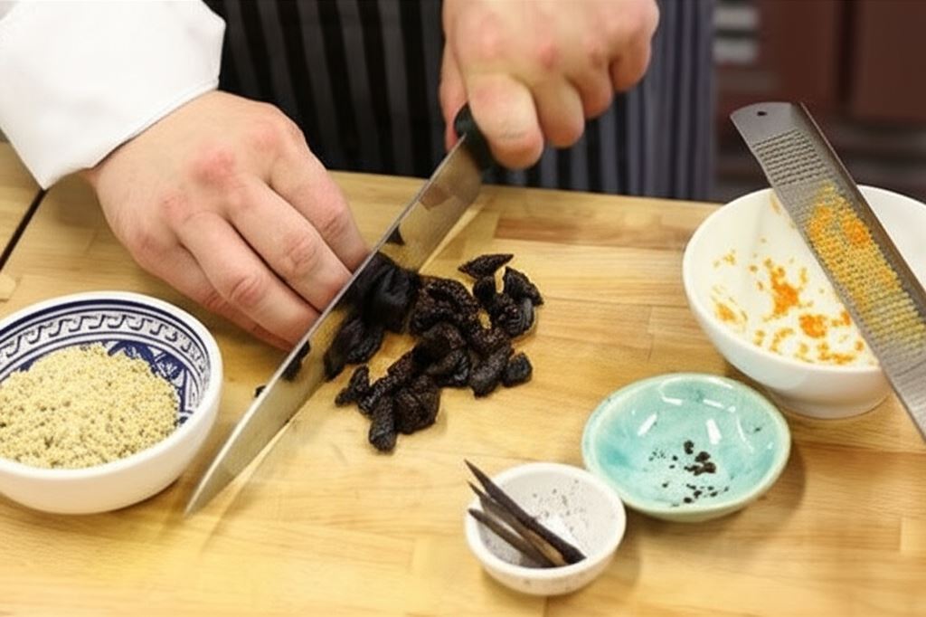 Rozgnieć w moździerzu goździki, laskę wanilii przetnij na połowę i wydobądź z niej ziarenka, pomarańczę zalej wrzątkiem, a potem zetrzyj jej skórkę, orzechy rozdrobnij na małe części, śliwkę posiekaj na niewielkie kawałeczki.