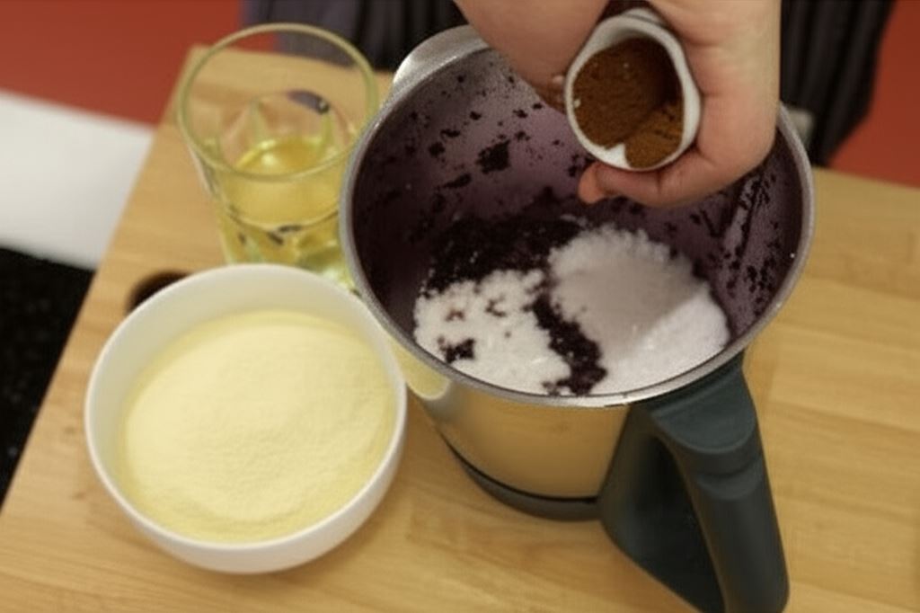 Wszystkie składniki – purée buraczane, sól, cynamon, goździki, gałkę muszkatołową, skórkę pomarańczową, wanilię, sodę, kakao, mąkę z jagieł, ksylitol, roztopioną czekoladę, sok z kokosa i olej umieść razem w naczyniu miksera i blenduj aż do uzyskania jednolitej gładkiej konsystencji. Na końcu do mieszaniny dodaj suszone śliwki.