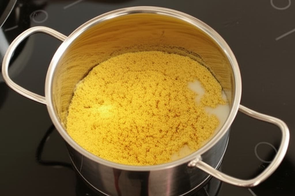 Kaszę jaglaną przepłucz w ciepłej wodzie, potem gotuj w mleku 20 min. Regularnie mieszaj aby się nie przypaliła. Odsuń z ognia i pozostaw pod przykryciem na 5 min.