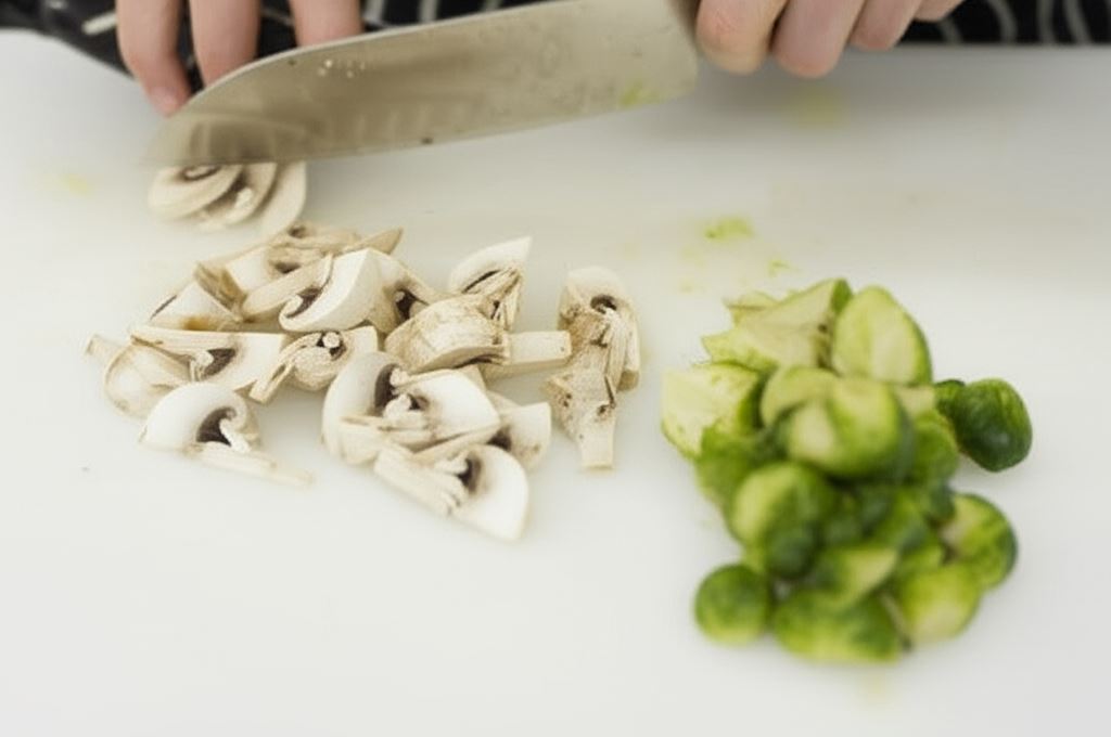 Brukselkę oczyść z zewnętrznych liści, a potem sparz przez kilka minut w osolonej wrzącej wodzie. Ostudź i przekrój na połówki. Pieczarki także przekrój na połówki – jeżeli są duże, pokrój je na ćwiartki.