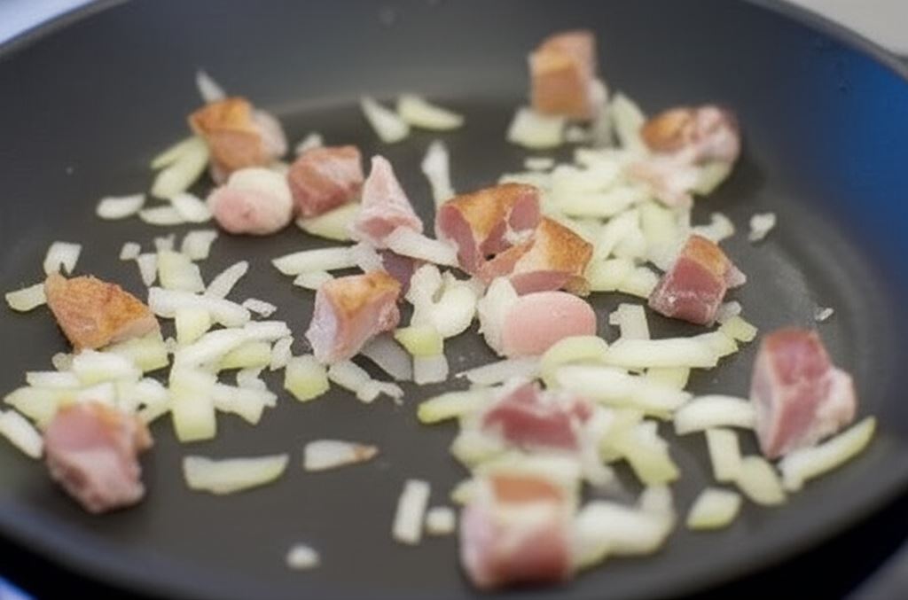 Boczek potnij na plastry, a potem w kwadraty 2x2 centymetry. Cebulę posiekaj w drobną kostkę – wraz z boczkiem obsmaż na rozgrzanej patelni.