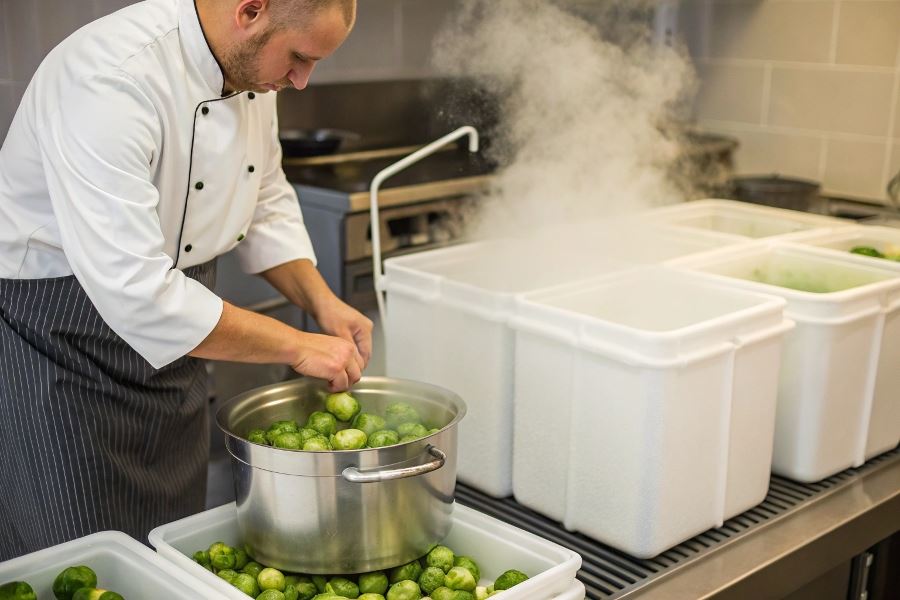 Szybkie schłodzenie po blanszowaniu jest niezbędne, ponieważ zatrzymuje proces gotowania i pomaga zachować kolor, teksturę oraz wartości odżywcze. Brukselkę należy trzymać w lodowatej wodzie przez taki sam czas, jak trwało blanszowanie.