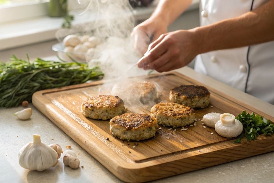 Temperatura smażenia jest kluczowa dla uzyskania idealnej tekstury. Rozgrzej patelnię do temperatury 175-185°C – to punkt, w którym kropla wody natychmiast odparowuje z charakterystycznym sykiem. Smażenie powinno trwać 3-4 minuty z każdej strony, aż kotlety uzyskają złocistobrązową, chrupiącą skórkę przy zachowaniu wilgotnego wnętrza.