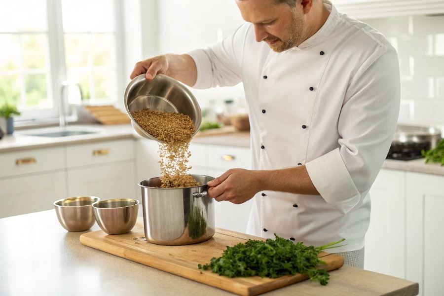 Kasza gryczana przygotowana tradycyjną metodą zachowuje pełnię smaku i wartości odżywczych. Aby uzyskać idealnie sypką kaszę, należy zachować proporcję 1:2 (jedna część kaszy na dwie części wody). Proces rozpoczyna się od opłukania kaszy zimną wodą, co usuwa nadmiar skrobi i zapobiega sklejaniu się ziaren.