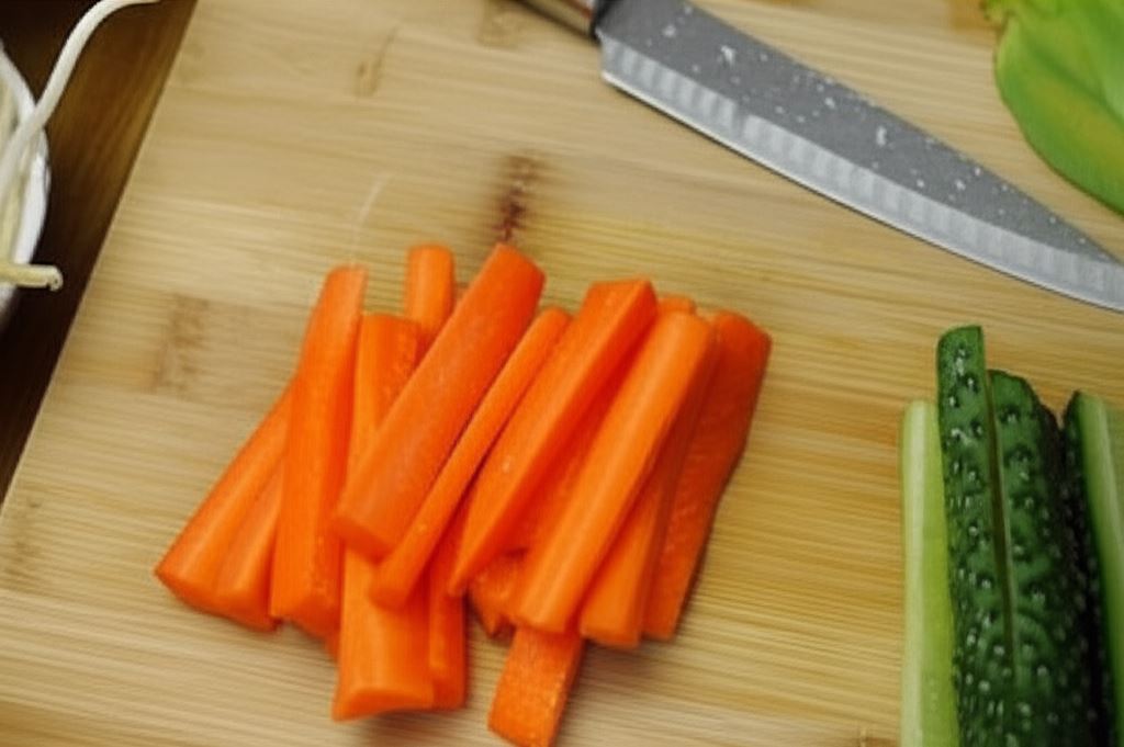 Warzywa opłucz pod bieżącą wodą. Marchew i ogórka obierz oraz pokrój w słupki, sałatę rozdziel na liście, awokado obierz, wyjmij pestkę i pokrój w plastry. Cieciorkę odsącz z zalewy.