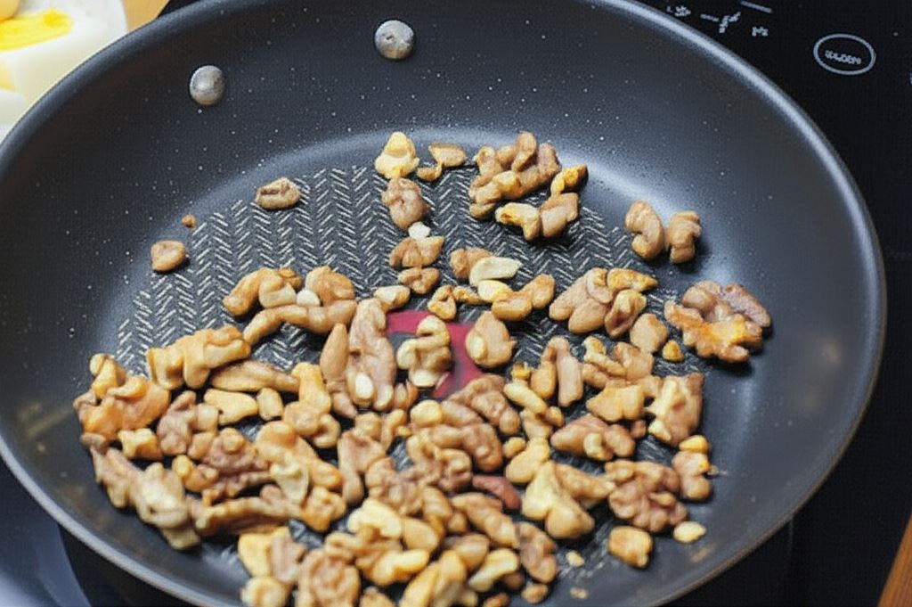 Na suchej patelni uprażyć orzechy włoskie. Jajka ugotuj na twardo i zdejmij skorupki.