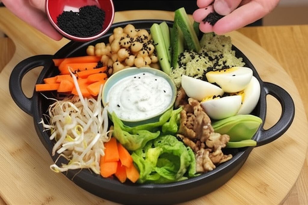 Na środku dużego talerza postaw miseczkę z sosem jogurtowym, a dookoła niej rozłóż wszystkie składniki dania. Na zakończenie posyp całość czarnuszką.
