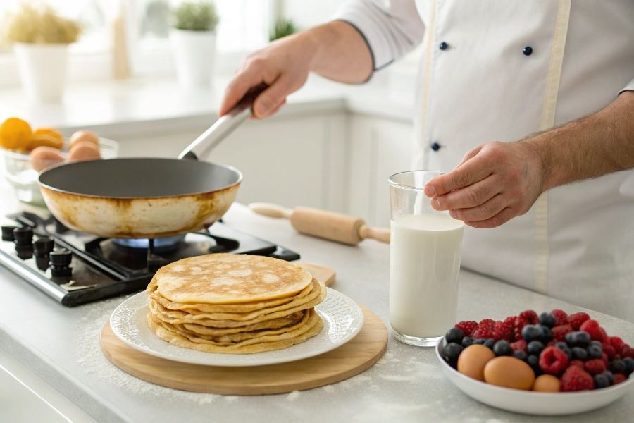 Sekret idealnych naleśników tkwi w odpowiedniej temperaturze patelni. Rozgrzej ją do momentu, gdy kropla wody „tańczy” na powierzchni, ale nie paruje natychmiast.