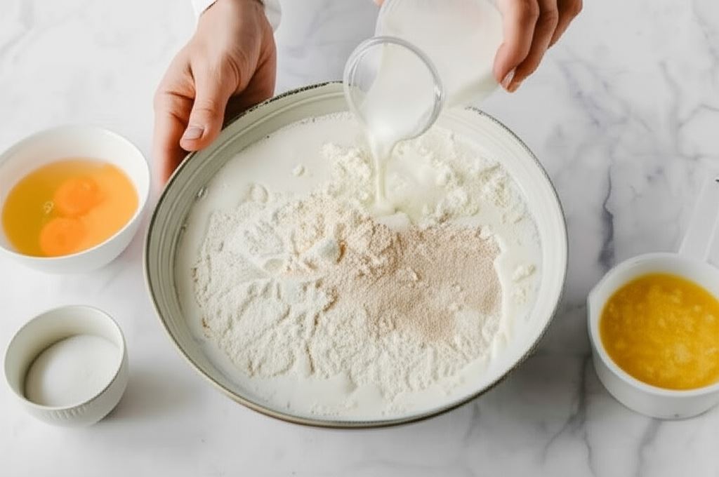 Mąkę łączymy z suchymi drożdżami. Dodajemy letnie mleko.