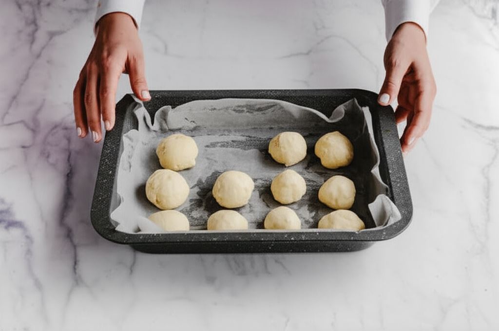 Ciasto musi zwiększyć swoją objętość dwukrotnie. Formujemy z niego niewielkie kulki i umieszczamy na blasze wyłożonej papierem do pieczenia. Odstawiamy na 30 min. do wyrośnięcia.