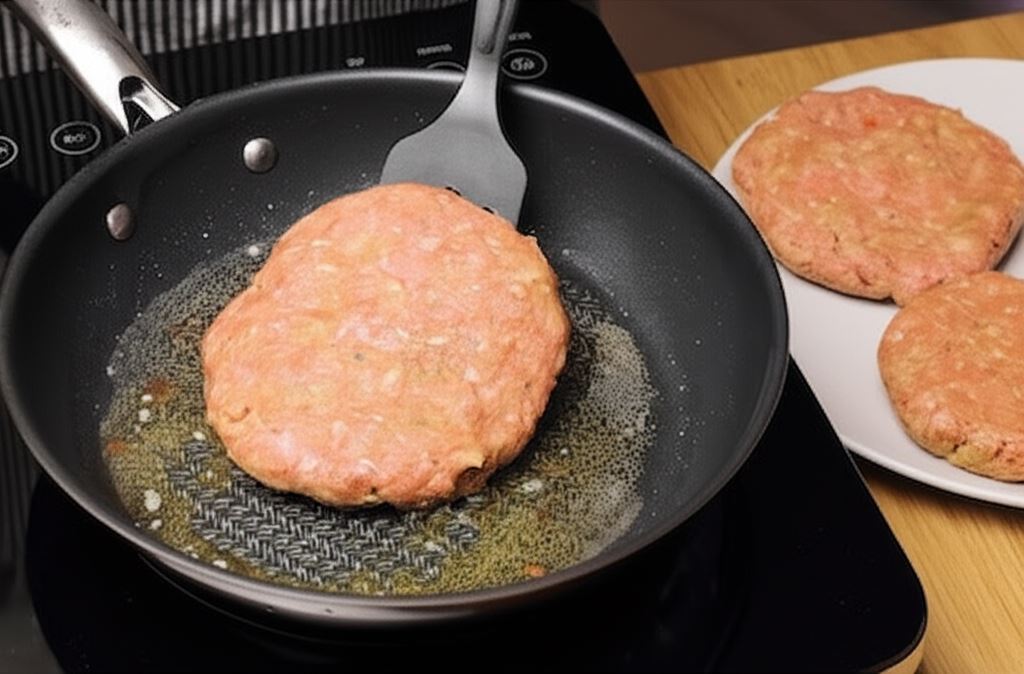 Z uzyskanej masy uformuj kotlety o średnicy bułki i grubości 1 cm. Na patelni rozgrzej olej i smaż burgery po 4 min z każdej strony.