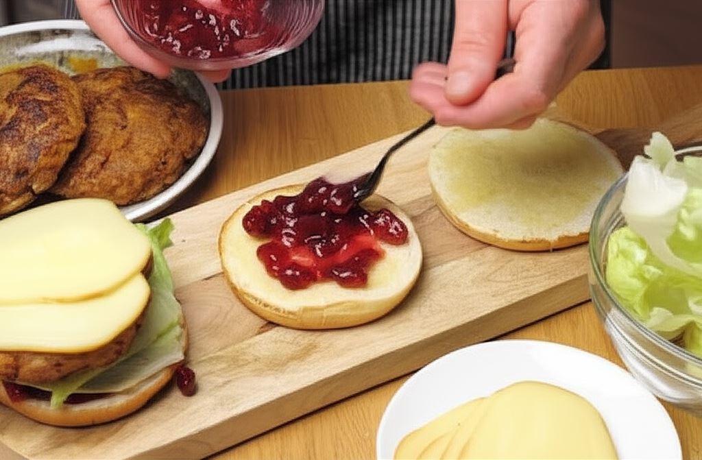 Po wypieczeniu dolną część bułeczki posmaruj konfiturą z żurawiny, potem ułóż sałatę, mięso oraz wędzony ser.