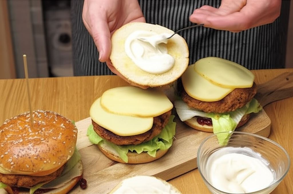 Nakryj wszystko górną częścią bułki posmarowaną majonezem. Serwuj z frytkami lub pieczonymi ziemniaczkami.