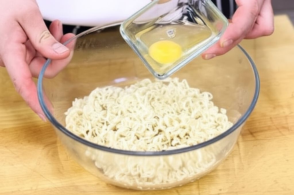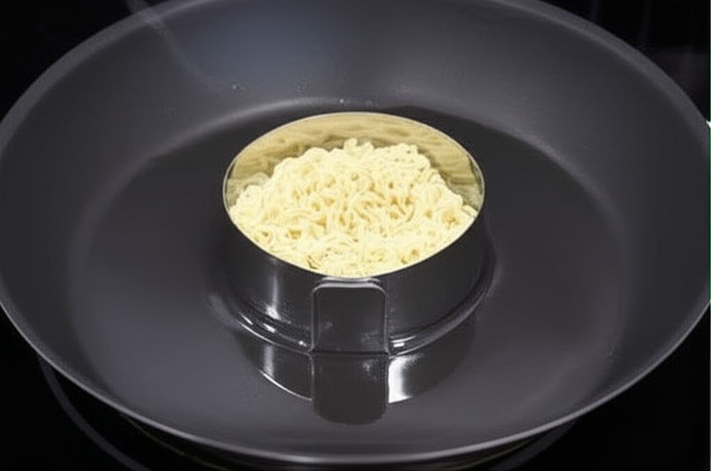 Zalej nudle gorącą wodą i odstaw na bok na 1 minutę, aby zmiękł makaron. Odcedź makaron, wymieszaj z jajkiem, rozdziel na 4 identyczne porcje. Umieść w naczyniu o okrągłym dnie np. metalowej miseczce albo odpowiednim okrągłym 'ringu'. Jeśli to możliwe, dociśnij makaron od góry, drugą miseczką i odstaw na 15 minut w chłodne miejsce.
