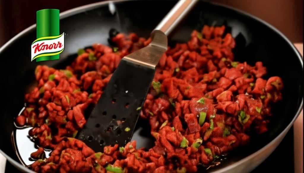 Mięso tniemy na plastry, a potem w małą kostkę. Wlewamy oliwę i dodajemy przyprawę do mięs Knorr, cynamon, goździki oraz posiekaną świeżą kolendrę. Mięso odkładamy na około 30 minut do lodówki.