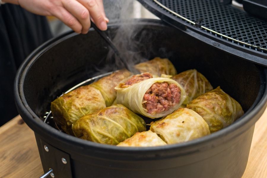 Kapustę do gołąbków w air fryerze należy blanszować krócej niż do tradycyjnych – około 3-4 minuty. Liście powinny być elastyczne, ale nie całkowicie miękkie. Po blanszowaniu warto je delikatnie osuszyć ręcznikiem papierowym, co zapobiegnie nadmiernej wilgoci podczas smażenia.