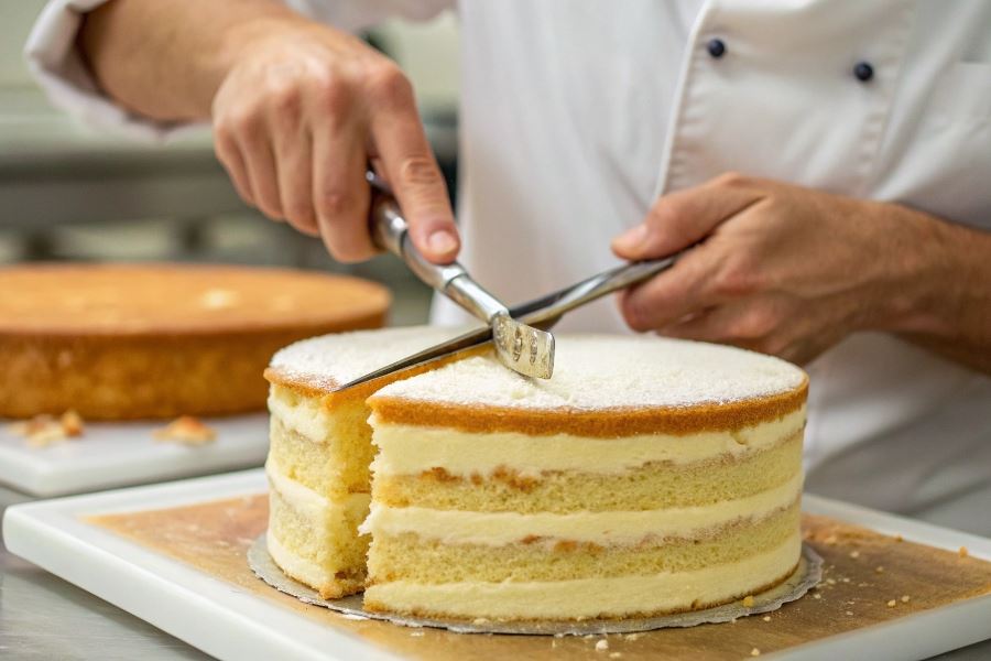 Jeśli biszkopt kruszy się podczas krojenia, zatrzymaj się i schłódź go dodatkowo przez 30 minut. Przy nierównych warstwach zastosuj szablon z kartonu lub linijkę cukierniczą jako prowadnicę dla noża.