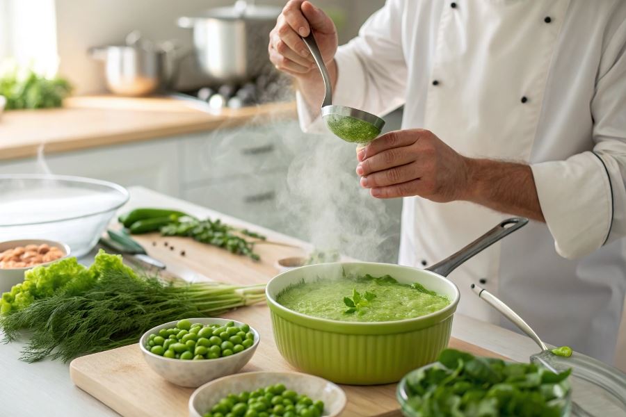 Profesjonalna rada: Dla wyjątkowego efektu wizualnego, podawaj puree z groszku z kroplą oliwy truflowej i płatkami parmezanu na wierzchu.
