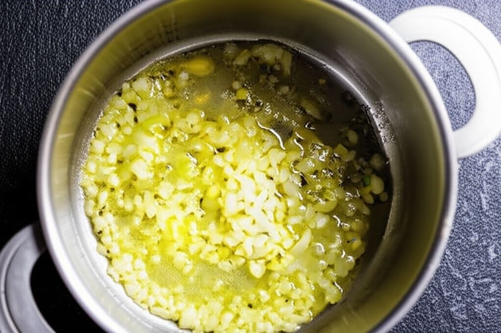 W garnku roztop margarynę i zrumień posiekany czosnek i cebulę.