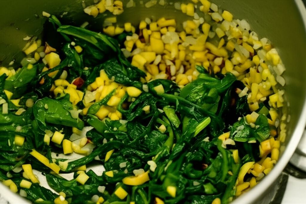 Wsyp rozdrobnione (nie za mocno) orzechy, szpinak i pokrojoną w kostkę dynię. Całość przesmaż przez minutę, by szpinak pozostał świeży i zielony.