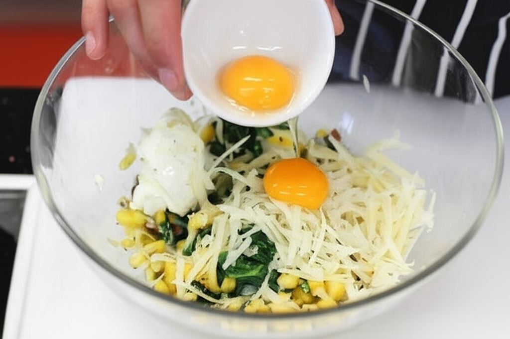 Umieść składniki w misce, wsyp twarożek, pół startego sera i żółtka. Wymieszaj nadzienie, w razie potrzeby dopraw.