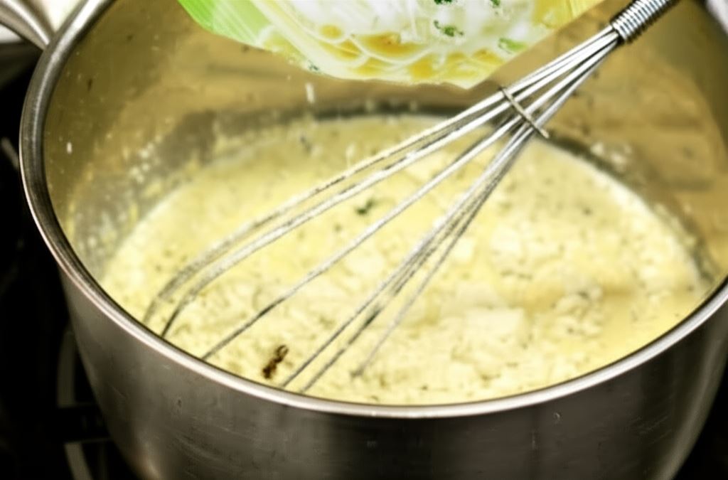 Zagotuj mleko z zawartością opakowania Fix Knorr. Potem wsyp resztę sera i zamieszaj, aż uzyskasz gładki sos.