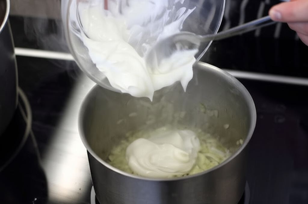 W garnku zrumień posiekaną jedną cebulę, dodaj śmietanę i dopraw według gustu. Sos gotuj przez 3 minuty.
