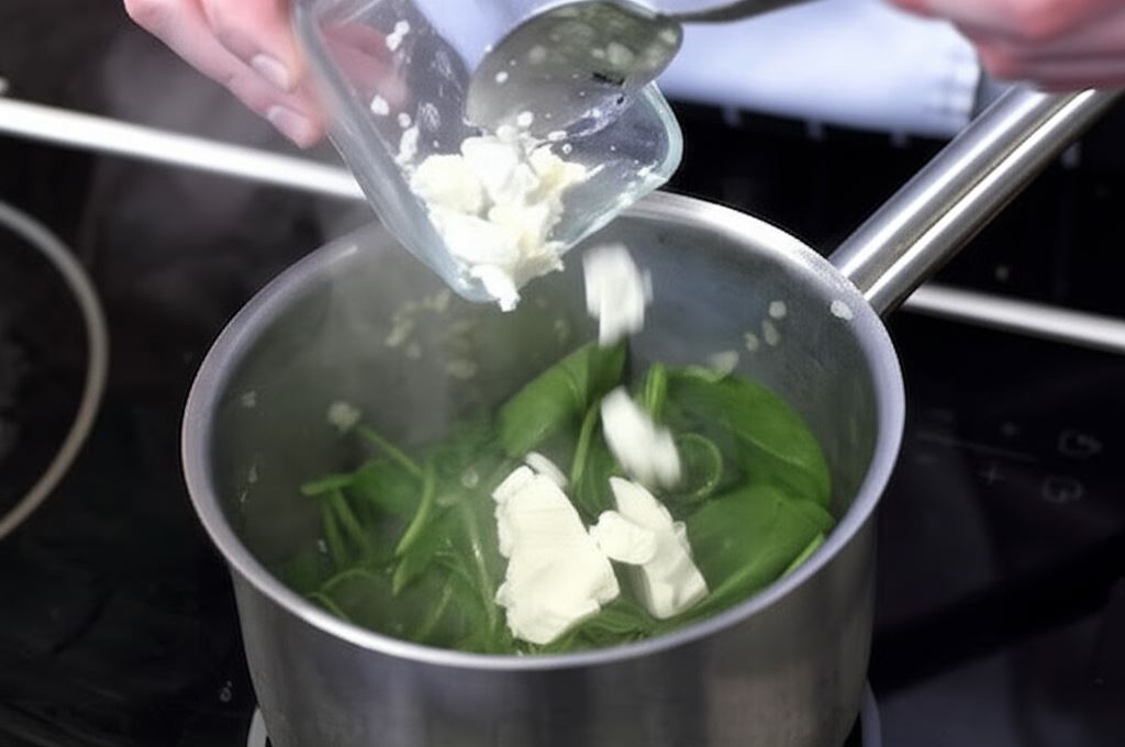 Drugą cebulę posiekaj w kostkę i zrumień na oliwie. Dodaj szpinak i podsmaż moment razem – na końcu wsyp pokruszony ser i zamieszaj.