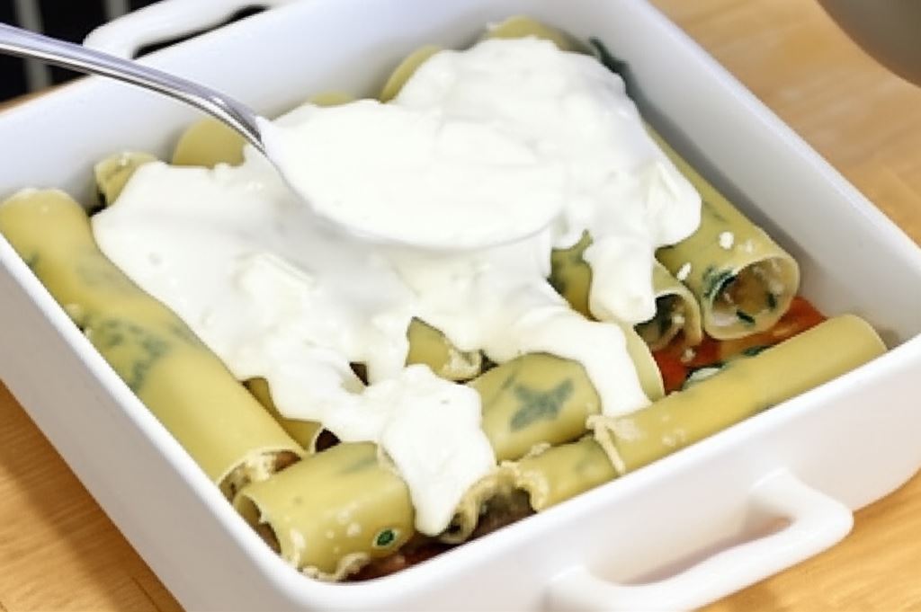 Napełnij przygotowanym szpinakiem makaron. Wypełnione rurki umieść w naczyniu na sosie z warzyw.