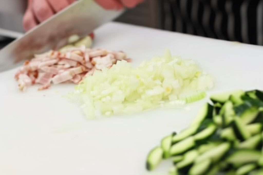 Cukinię dokładnie obmyj, przetnij wzdłuż na połówki, potem w plastry. Czosnek, boczek i cebulę posiekaj w małą kostkę.