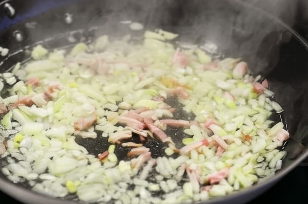 W szerokim garnku podgrzej część oliwy i podsmaż na niej boczek, cebulę oraz czosnek.