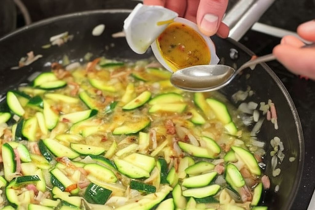 Odcedź ugotowany makaron, zachowując wodę. Do smażonej cukinii z boczkiem wlej jedną chochelkę wody i wsyp Sos do pieczeni jasny Knorr. Wymieszaj wszystko dokładnie.