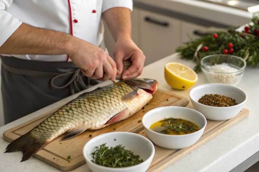 Przed marynowaniem karpia należy go dokładnie oczyścić, usunąć łuski, skrzela i wnętrzności. Filetowanie pozwala na lepszą penetrację marynaty, jednak wymaga wprawy. Alternatywnie można naciąć skórę ryby w kilku miejscach, co również ułatwi wnikanie aromatów.