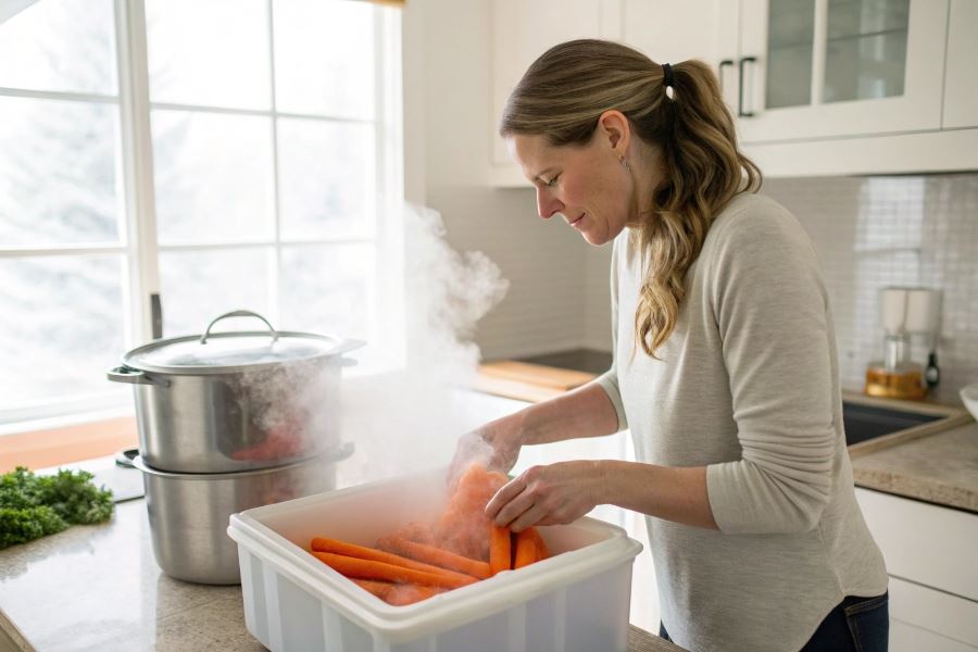 Po blanszowaniu konieczne jest natychmiastowe schłodzenie w lodowatej wodzie, co zatrzymuje proces gotowania. Marchewkę zanurzamy w misce z zimną wodą i kostkami lodu na czas równy blanszowaniu. Następnie dokładnie odsączamy na sicie lub papierowych ręcznikach – nadmiar wilgoci może prowadzić do powstawania kryształków lodu i pogorszenia jakości mrożonek.