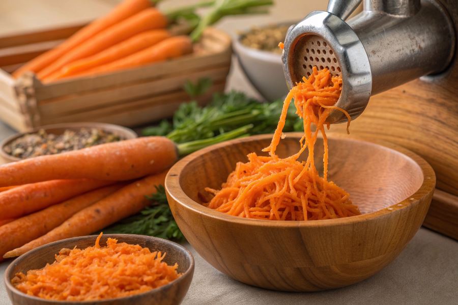 Marchew przepuszczona przez maszynkę zachowuje więcej soku niż tarta na tradycyjnej tarce, co przekłada się na soczystość i intensywność smaku potraw.