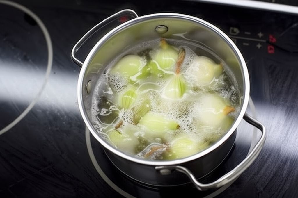 Cebule gotuj przez parę minut w delikatnie osolonym wrzątku. Odetnij górne części. Wydrąż wnętrza, posiekaj je.