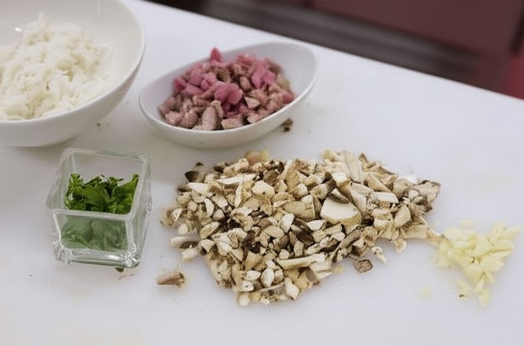 Pieczarki posiekaj drobno. Ryż ugotuj na sypko. Pieczeń pokrój w paski. Czosnek przepuść przez praskę, natkę pietruszki drobno posiekaj.