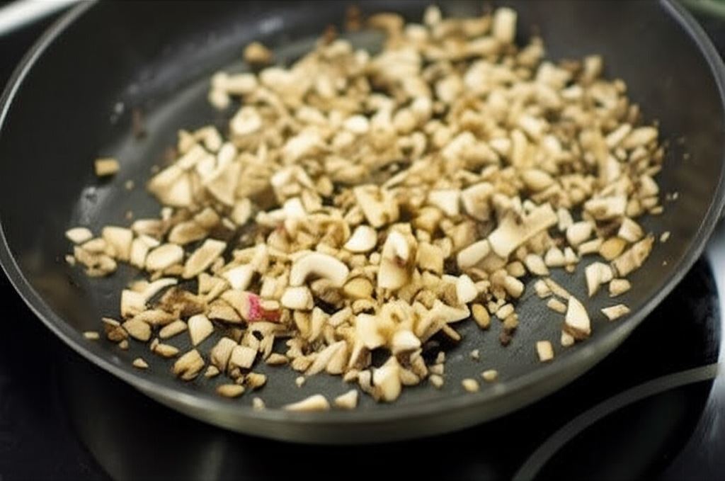 Na rozgrzanym tłuszczu zeszklij pokrojone środki cebul, osobno przesmaż pieczarki.