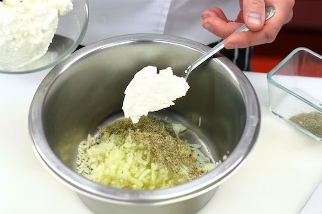 Sporządź farsz serowy. W miseczce wymieszaj zmielony twaróg z przeciśniętymi przez praskę ugotowanymi ziemniakami, czosnkiem, majerankiem i cebulą.